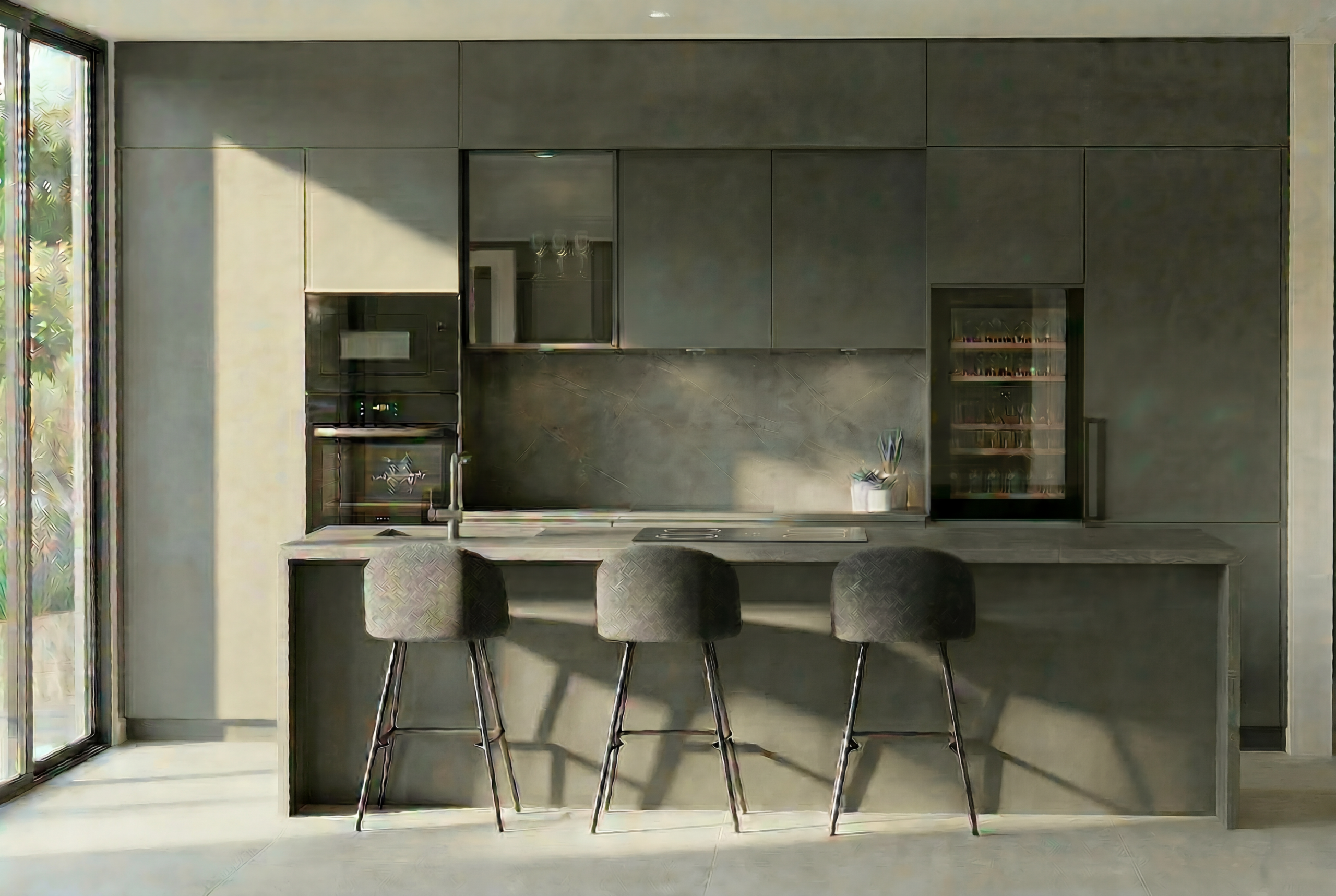 La planta baja ha sido diseñada como el auténtico corazón de la villa. Un espectacular salón con doble altura crea una sensación de amplitud y sofisticación poco común, mientras que la cocina con gran isla central se integra con naturalidad en la zona de día y se abre hacia una refinada terraza chill-out cubierta, conectada con la piscina y el jardín. Todo el conjunto ha sido concebido para disfrutar de una forma de vida abierta, luminosa y profundamente mediterránea.